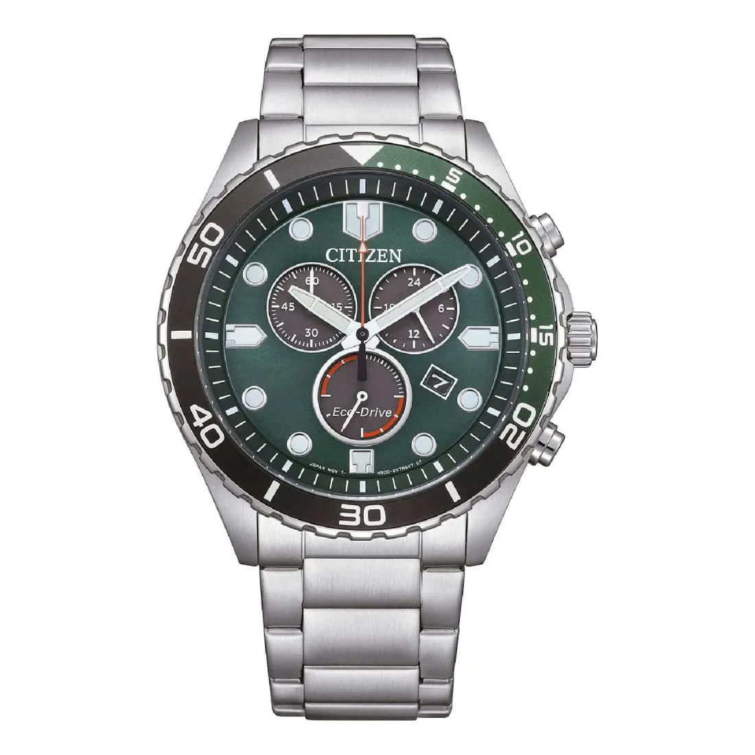 Ρολόι Citizen με κάσα 43mm από ασημί ανοξείδωτο ατσάλι και εντυπωσιακό πράσινο καντράν με λειτουργία χρονογράφου. Το μπρασελέ είναι κατασκευασμένο από υψηλής ποιότητας ανοξείδωτο ατσάλι, προσφέροντας άνεση και ανθεκτικότητα. Με αδιάβροχη προστασία έως 100 μέτρα, είναι ιδανικό για κολύμβηση και καθημερινή χρήση. Ένα κομψό και αξιόπιστο ρολόι που συνδυάζει στυλ και λειτουργικότητα.